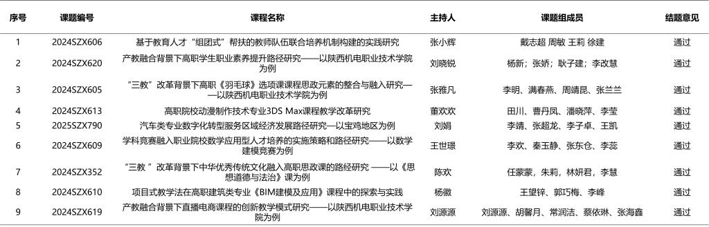 根据省职教学会《关于公布陕西省职业技术教育学会立项课题提前结题结果的通知》(陕职学〔2025〕14号)要求,经学校评审后报送、省社组织专家评审,学院9项课题符合结题要求,通过结题验收。