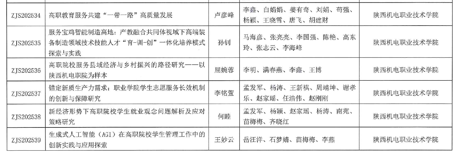 根据宝省中华职业教育社《关于公布2025年度职业教育课题立项名单的通知》(陕科发〔2025〕31号)要求,学院6项课题获批立项。请课题负责人组织成员按照课题方案,有计划地开展研究工作,及时加入课题,参加省社统一组织开题工作。