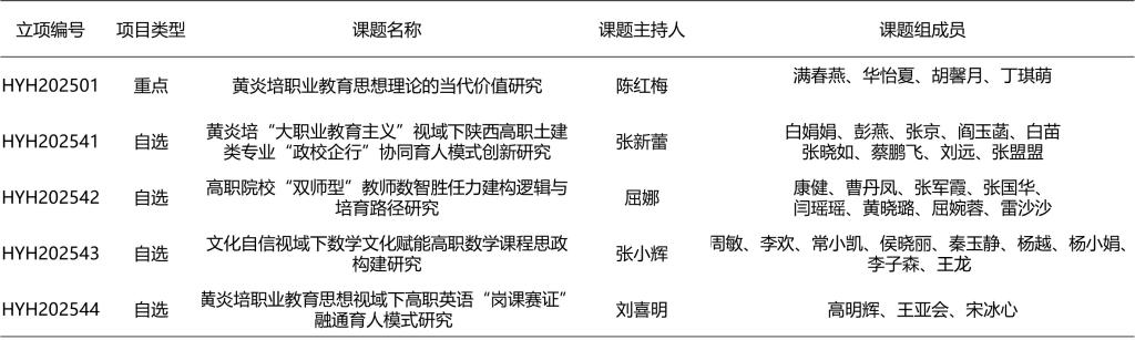根据《陕西省中华职业教育社 陕西省黄炎培职业教育思想研究会关于公布职业教育课题立项名单的通知》(陕科发〔2025〕30号)要求,学院5项课题获批立项。请课题负责人组织成员按照课题方案,有计划地开展研究工作,及时加入课题,参加省社统一组织开题工作。