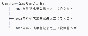 部门汇总材料文件夹命名:XX部门2025年度科研成果登记。文件夹内存放Excel汇总表,文件命名格式按附件1中表格名称命名,为2025年度科研成果登记表之X(类别)(如:2025年度科研成果登记表之一(论文类))。